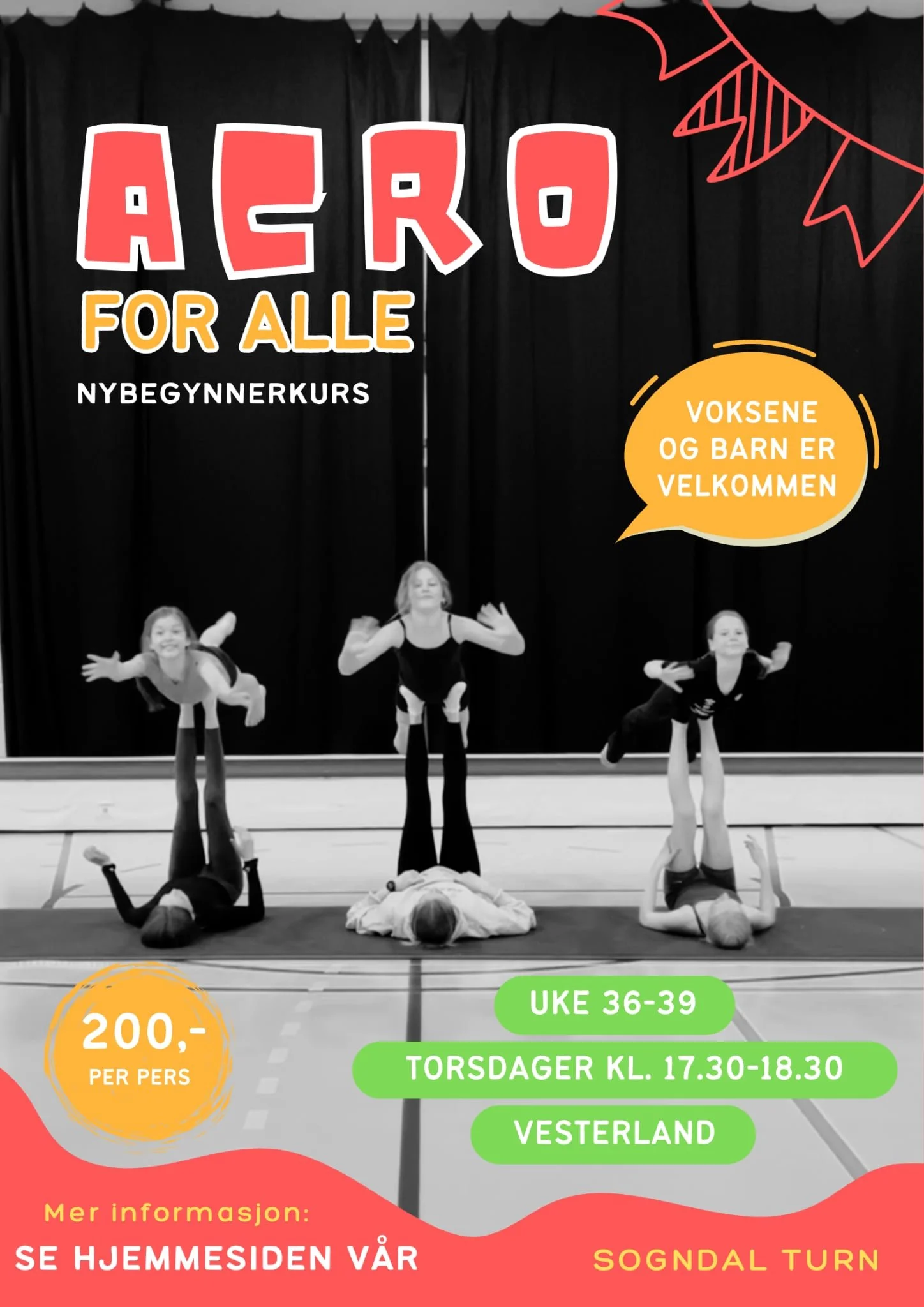 Ønsker du en ny og spennende utfordring? Vi starter høsten med et nybegynnerkurs i akrobatikkkurs. Ta med deg venner og familie og bli med på et sosialt og morsomt kurs! Akrobatikk er når to eller flere personer samarbeider for å lage kule og morsomme bevegelser med kroppen. Man kan løfte hverandre, stå på hverandre eller lage forskjellige figurer, og man må bruke både styrke, balanse og samarbeid. Se vår instagram eller facebook for video.